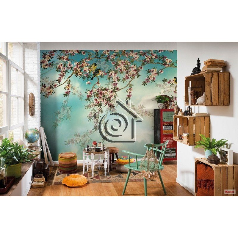 Ramas en flor con pájaros posados y cantando.