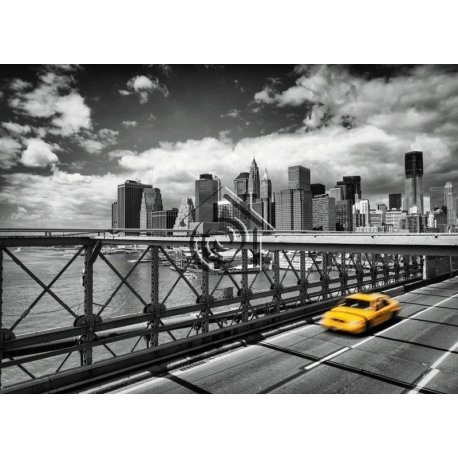 Vista de Nueva York en blanco y negro con un taxi amarillo.