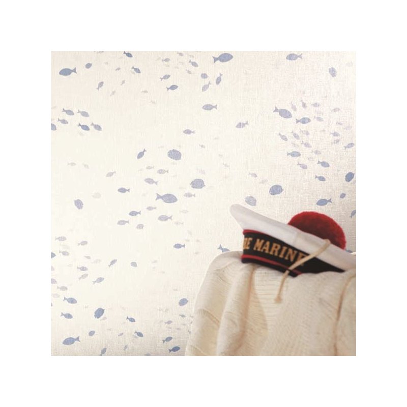 Papel pintado realizado en vinilo sobre papel con una textura lino con un motivo de pececitos en color café con leche.